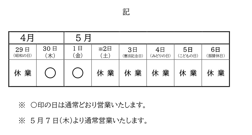 弊社では下記日程をゴールデンウイーク休業とさせていただきます。